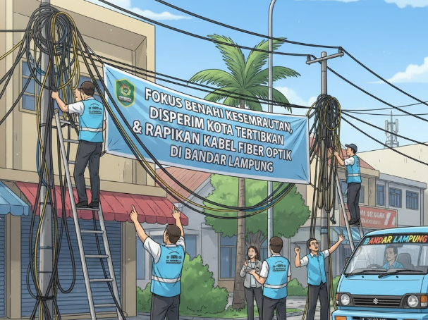 Bandar Lampung – Dinas Perumahan dan Permukiman (Disperkim) Kota Bandar Lampung gencar melakukan penertiban dan perapian jaringan utilitas kabel fiber optik. Hal ini dilakukan sebagai bentuk komitmen Pemerintah Kota (Pemkot) dalam mengatasi kesemrawutan dan menjaga estetika di kota tapis berseri, Kamis 9 Oktober 2025.