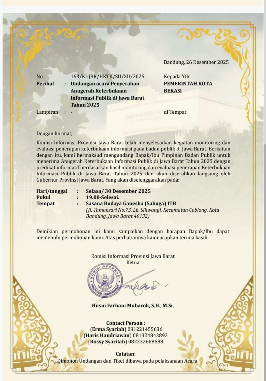 Capaian tersebut menegaskan komitmen Pemerintah Kota Bekasi dalam mewujudkan tata kelola pemerintahan yang transparan, akuntabel, dan partisipatif, sekaligus konsisten memberikan layanan informasi publik yang terbuka, mudah diakses, dan bertanggung jawab kepada masyarakat.