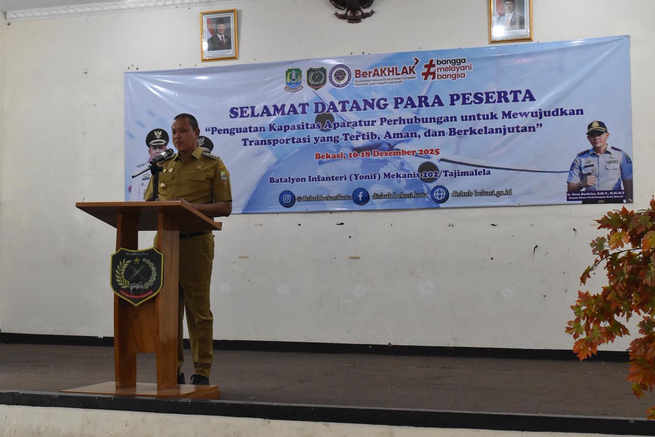 Pemerintah Kota Bekasi menggelar kegiatan Penguatan Kapasitas Aparatur Perhubungan untuk Mewujudkan Transportasi yang Tertib, Aman, dan Berkelanjutan pada Selasa, (16/12/25). Kegiatan ini dilaksanakan di Batalyon Infanteri (Yonif) Mekanis 202/Tajimalela dan diikuti oleh jajaran aparatur perhubungan Kota Bekasi.