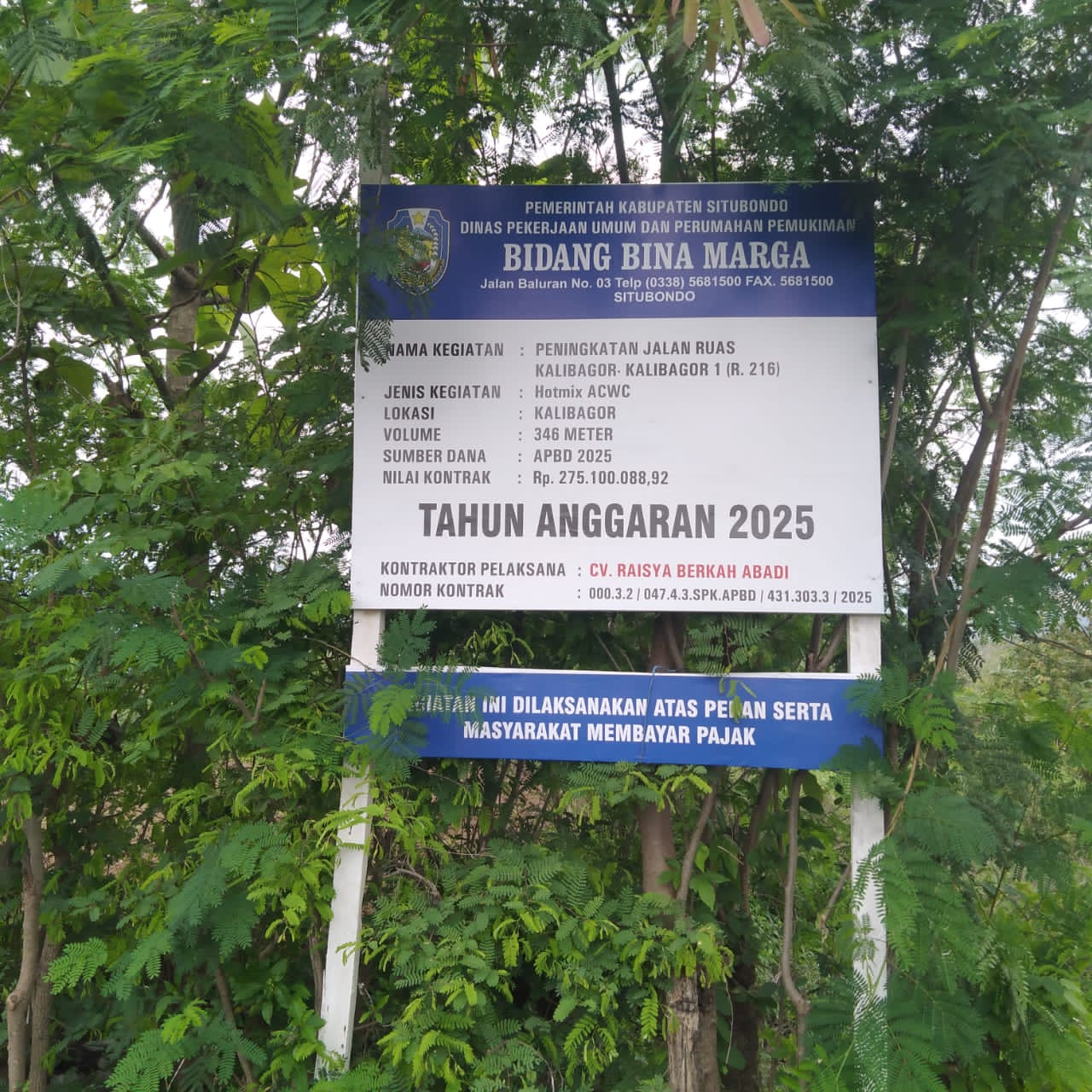 Proyek pembangunan jalan hotmix di Kabupaten di desa kalibagor Situbondo, Jawa Timur, yang dikerjakan oleh CV Raisah Berkah Abadi, dituduh dikerjakan asal-asalan dan tidak sesuai dengan spek. Proyek yang menghabiskan anggaran sebesar Rp 275.100.088,89 ini baru saja selesai dikerjakan, namun sudah banyak yang tertelupas dan batu kerikilnya sudah berhamburan.