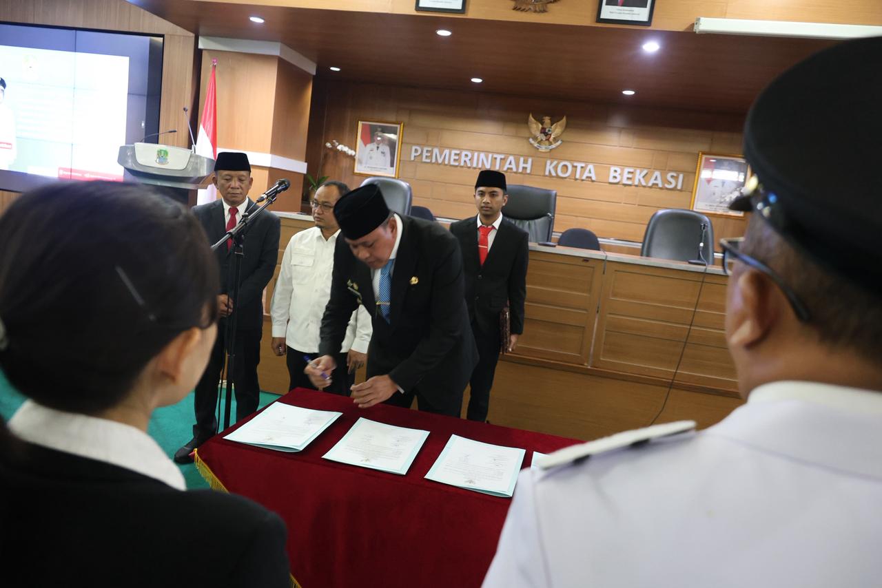 Wali Kota Bekasi, Tri Adhianto, melaksanakan pengambilan sumpah jabatan serta rotasi dan mutasi aparatur sipil negara (ASN) di lingkungan Pemerintah Kota Bekasi (6/2/26). Sebagai bagian dari upaya penyegaran organisasi dan pengisian jabatan yang kosong. Kegiatan ini dilakukan terhadap puluhan pejabat struktural Eselon III dan IV, sekaligus kepala unit pelayanan di bidang kesehatan.