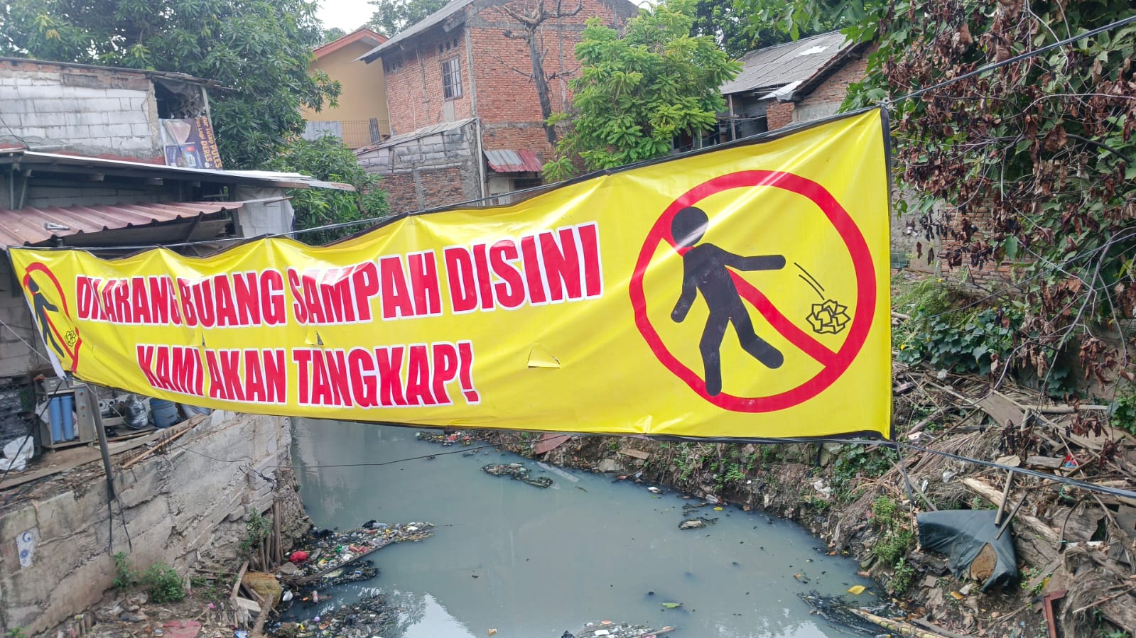 Menanggapi maraknya aksi pembuangan sampah liar di kawasan Jembatan Kali Baru, warga RW 02 Kelurahan Kali Baru, Kecamatan Medan Satria, Kota Bekasi, mengambil langkah tegas dengan memasang spanduk bertuliskan: